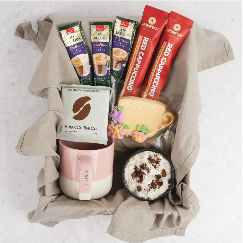 - Includes 1 Pink Cup, 1 Coffee Candle, 1 Smak Milk Chocolate, 1 Cup Cookie, 2 red espresso cappuccino sachets & 3 Cadbury Hot Chocolate sachets.